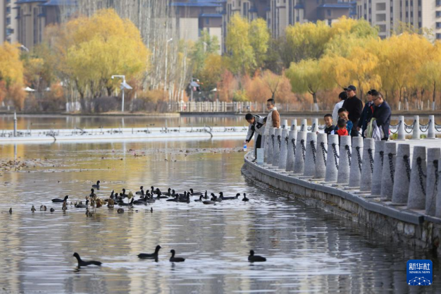 11月9日,游客在甘肃省定西市一公园内赏景游玩。
