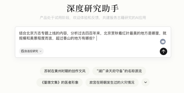 人们会打开各种平台搜赏秋路线,得到的多半是“热门、更热门、最热门”,果然只要点赞高的,都是人比红叶多。大家追着同款网红路线转圈,自然越挤越堵。有没有一种方法,能把视野从网红景点中抽出来呢,对于有三千年建城史的北京来说,其实可以试着把问题交给古籍数字化平台“识典古籍”,因为它自带一位“深度研究助手”,用完后,发现这位助手简直是高手。