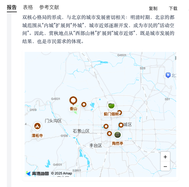 恰好,识典古籍平台在近期上线了“北京旧志数据库”,各区县的方志都实现了数字化。深度研究助手可以几分钟生成可溯源的“古籍版北京赏秋地图”。每一个地名都附可点击的引文出处,能回到原文上下文。挖出的都是“文献印证的小众去处”,帮我们绕开扎堆。