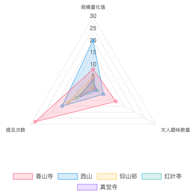 而西山则完全是另一种气魄。AI数据显示其“规模量化值”高达20,这源于古籍对其“绵亘二十里”的广阔区域描述,以及“千林红叶”的震撼景观。西山这种大规模的区域景观,更能给人带来铺天盖地的视觉冲击力。如果你想看“众山红遍”的宏大秋景,识典古籍告诉你,应该去西山——即现在的西山风景区和香山以西的山脉区域。