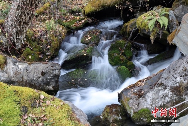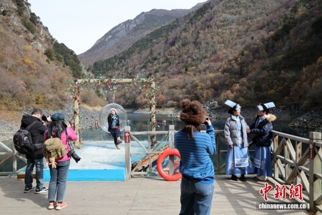 11月19日,初冬季节的四川省茂县松坪沟风景区景色如画,彩色山林与清澈的高山湖泊、溪流构成一幅幅美景,令游客流连忘返。