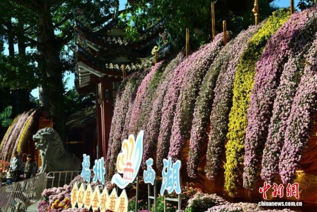 11月20日,正在福建福州西湖公园举行的菊花展,吸引许多市民和游人前来赏花。图为通过悬崖菊打造的“流光溢彩”景点。中新社记者 张斌 摄