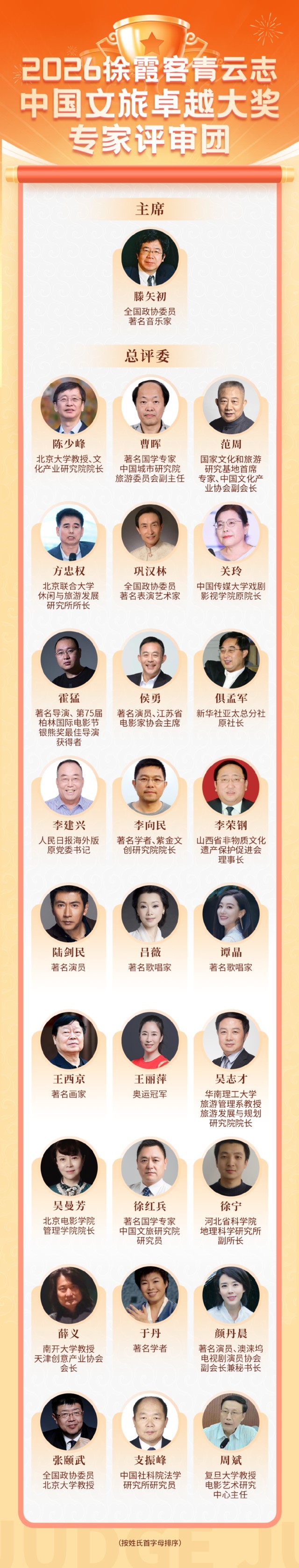 四百年前,徐霞客以双脚丈量山河,铸就中国旅行文化的精神丰碑;四百年后,28位跨领域顶尖力量强势集结,为中国文旅高质量发展注入权威动能!近日,由中国国际网红集团联合主办的“徐霞客青云志中国文旅卓越大奖”专家评审团正式揭晓,滕矢初、于丹、张颐武、谭晶、巩汉林、侯勇、霍猛等28位行业标杆联袂坐镇,横跨文化学术、艺术表演、影视传播、文旅规划、传媒公信力五大核心领域,以专业为尺、以热爱为度,共同勾勒中国文旅产业的品质新蓝图。