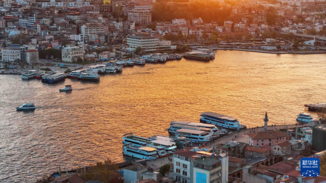 11月24日,夕阳的光辉照耀在土耳其伊斯坦布尔金角湾的水面上。