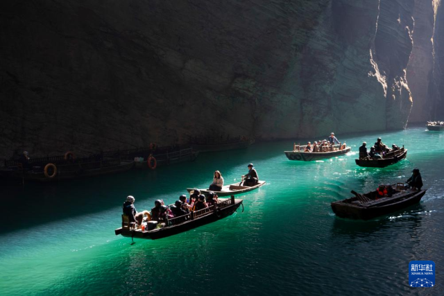 初冬时节,湖北省恩施土家族苗族自治州鹤峰县屏山峡谷迎来迷人景观。正午时分,阳光穿过幽深峡谷,将蜿蜒的“一线天”照亮,舟行水上若悬浮于空中,形成了独特的“舟浮空中”奇观。