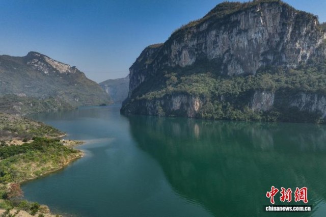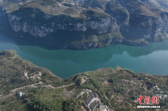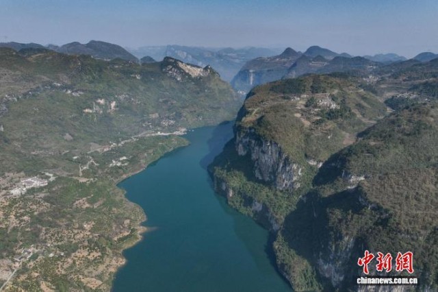 11月26日,航拍贵州黔西马路河大峡谷初冬景美。 初冬时节,贵州省黔西市素朴镇马路河大峡谷河水清澈,崖壁陡峭。蜿蜒的乌江河流与峡谷相互映衬,构成一幅初冬山水画卷。 记者 瞿宏伦 摄