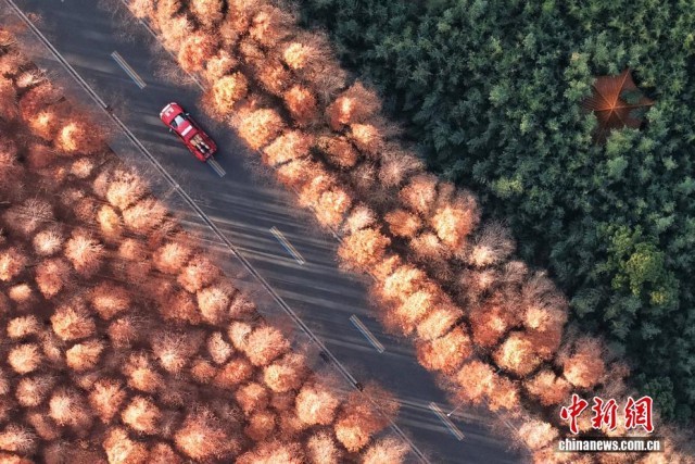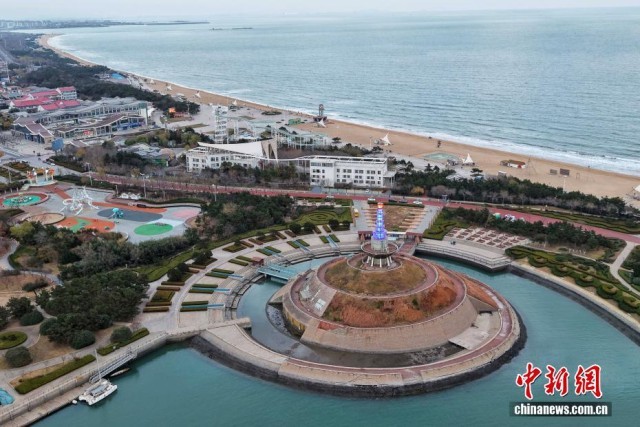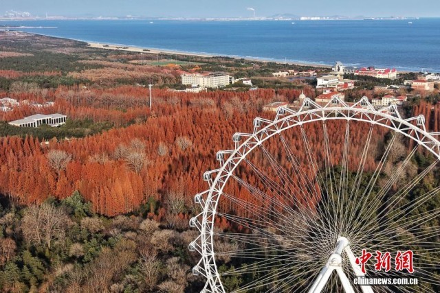 12月1日,山东日照,市民游客在万平口景区金色沙滩游玩。冷空气过境后日照正式入冬,但城市街巷仍留深秋余韵。金色沙滩与碧绿大海交相衬托,各色树叶斑斓交织,色彩错落有致,绘就了一幅如诗如画的自然画卷。(无人机照片)
