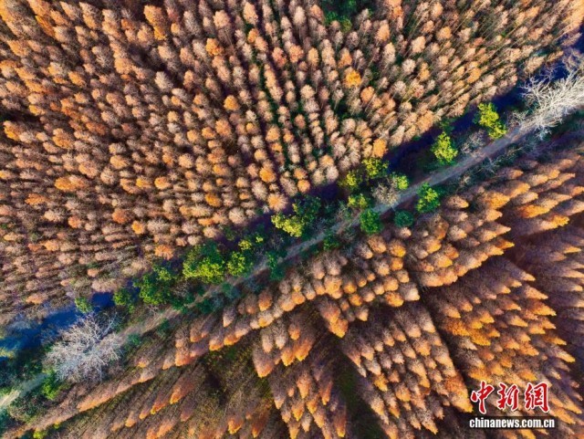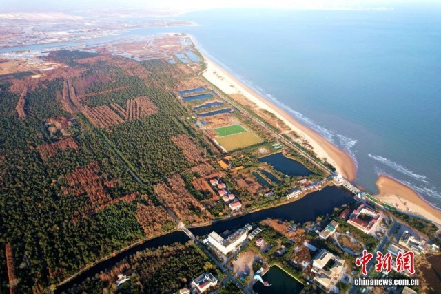 12月1日,山东日照,航拍海滨国家森林公园。冷空气过境后日照正式入冬,但城市街巷仍留深秋余韵。金色沙滩与碧绿大海交相衬托,各色树叶斑斓交织,色彩错落有致,绘就了一幅如诗如画的自然画卷。(无人机照片)