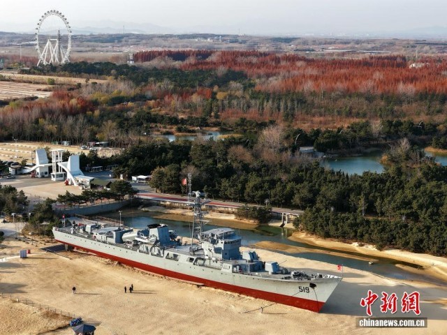 12月1日,山东日照,航拍日照世帆赛基地,游艇停靠在码头。冷空气过境后日照正式入冬,但城市街巷仍留深秋余韵。金色沙滩与碧绿大海交相衬托,各色树叶斑斓交织,色彩错落有致,绘就了一幅如诗如画的自然画卷。(无人机照片)