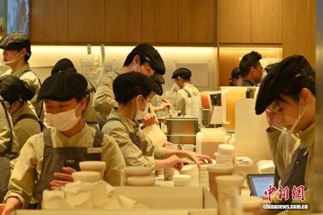 12月1日,游客在安徽省广德市一家奶茶店加紧赶制商品。中新社记者 张强 摄