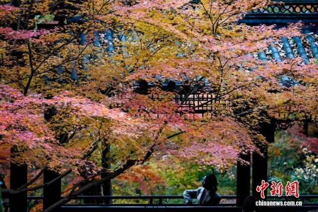 12月2日,江苏南京,游客在栖霞山上欣赏枫叶。近日,作为中国四大赏枫胜地之一的南京栖霞山迎来枫叶最佳观赏季,叶子层层叠叠,灿若云霞,游客穿行其间,仿佛置身画卷之中。
