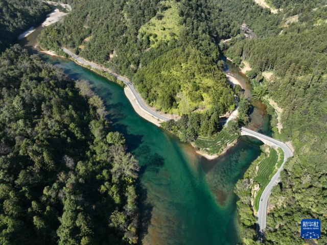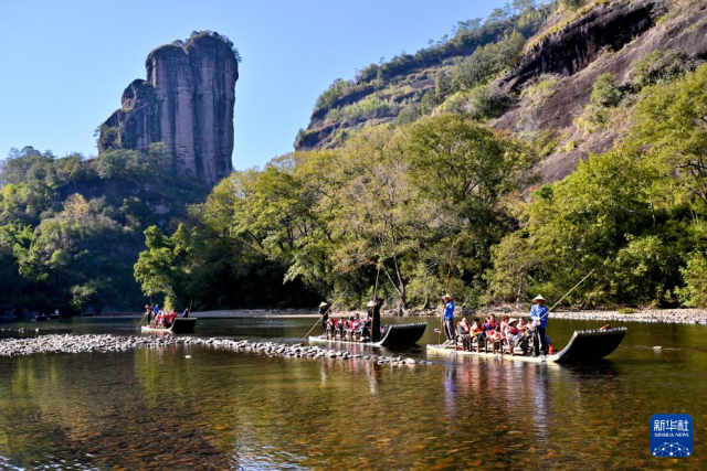 近日,福建武夷山天蓝水碧,绿水青山中色彩斑斓的枫树、水杉等林木点缀其间,呈现别样的冬日景致,吸引游客前来旅游休闲。