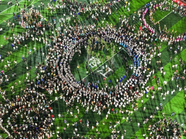 8月23日,人们在贵州“村超”球场跳苗族芦笙舞(无人机照片)。新华社记者杨文斌 摄