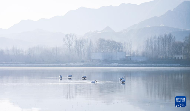 近日,青海省海东市化隆回族自治县的黄河湿地迎来近百只越冬天鹅。