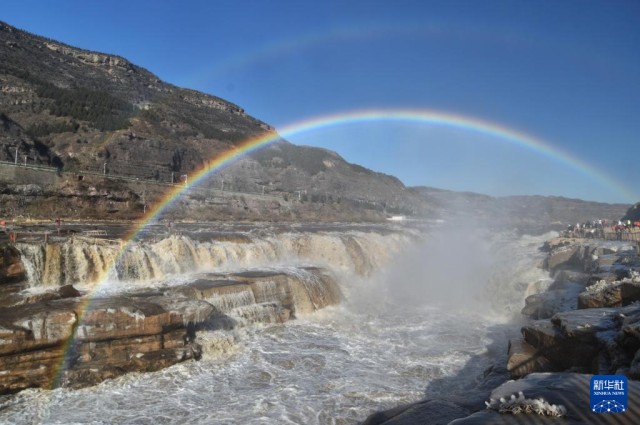 12月3日,游客在山西吉县黄河壶口瀑布景区欣赏“双彩虹”景观。
