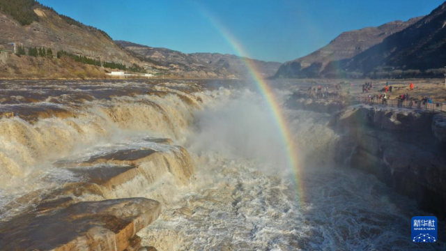 受上游水库调节放水影响,位于山西吉县和陕西宜川县交界处的黄河壶口瀑布水量增大,飞溅的水雾在阳光照射下形成“双彩虹”,吸引了众多游客。