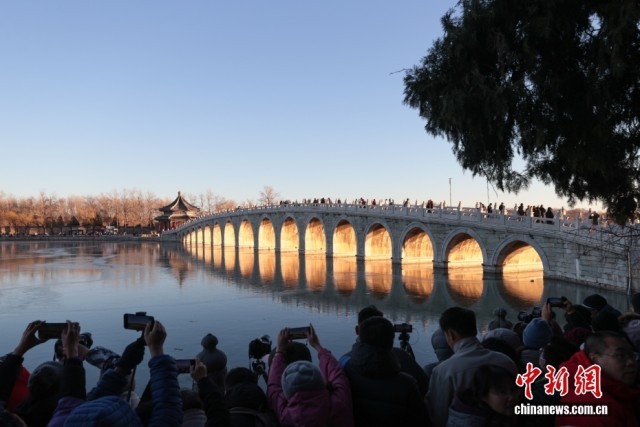 12月4日,北京颐和园十七孔桥“金光穿洞”景观进入观赏期,吸引众多游客拍照。