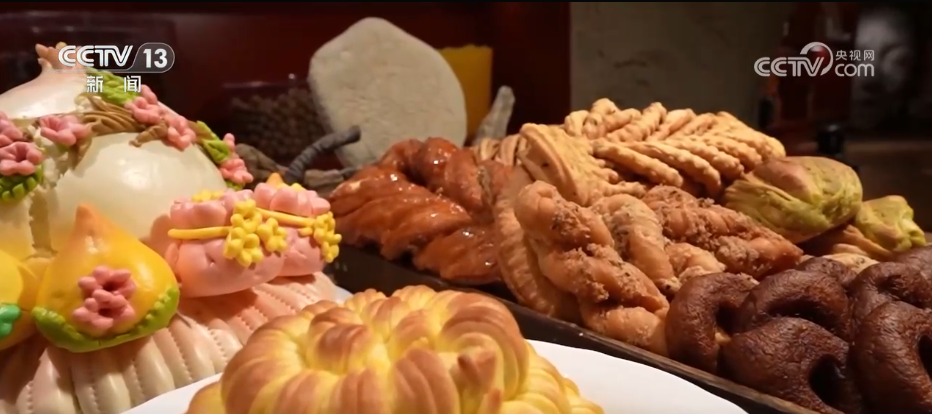 吃羊杂,少不了要配上一口热腾腾的面点。集市上,馓子、南瓜小油香、麻团和油条等各式面点一字排开,香气扑鼻,不少人是直奔这些“主食担当”而来。店主把和好的面团切成小块,拉成长条,再抹上香油、撒上芝麻,送进烤炉里烤上几分钟,松软微酥、香气浓郁的牛舌饼就新鲜出炉了,成为不少食客碗边的标配。