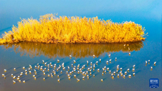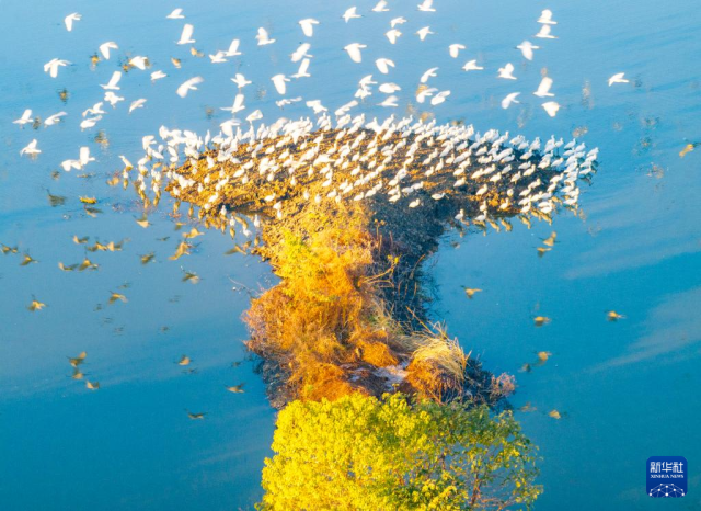 ??12月6日,群鸟在江苏兴化里下河国家湿地公园内栖息、觅食(无人机照片)。