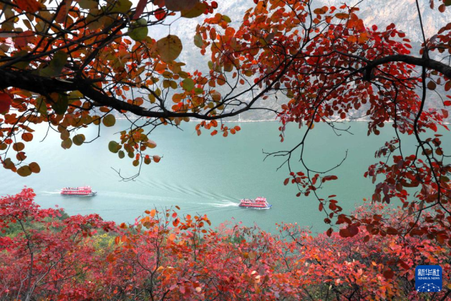 ??12月7日,船只行驶在红叶映衬下的长江三峡巫峡段。