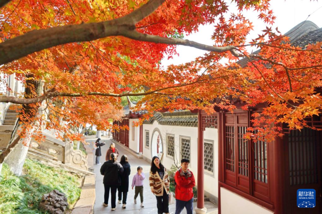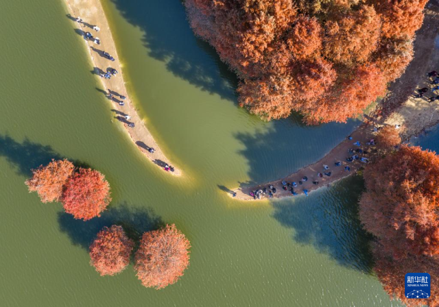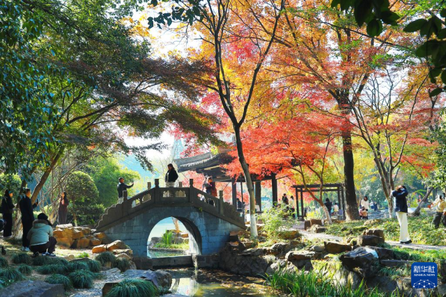 ??12月8日,游客在浙江省嘉兴市南湖景区湖心岛观赏枫叶。