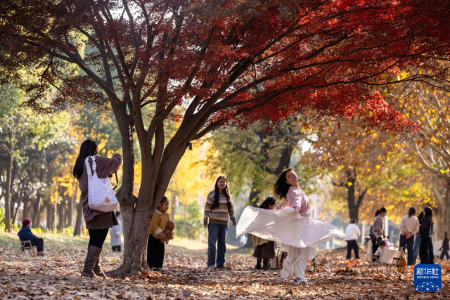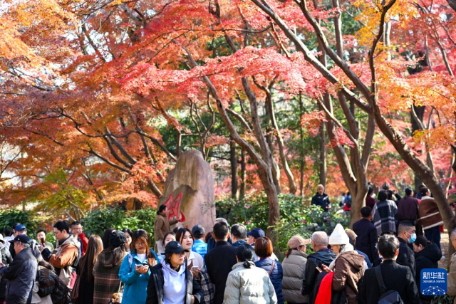 ??12月7日,游人在江苏南京中山植物园观赏枫叶。