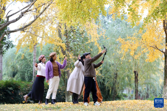 ??12月6日,市民在四川省乐山市一处银杏树下游玩拍照。