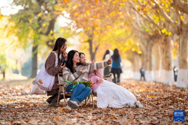 ??12月7日,游客在江苏泰州医药城梧桐大道打卡拍照。