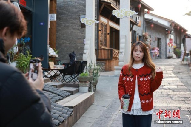 12月8日,民众在刘祠堂背历史文化街区拍照打卡。刘祠堂背历史文化街区是浙江丽水城区留下来的唯一明清古街。近年来,街区近年来遵循 “修旧如旧” 原则实施改造,在完整保留其历史风貌与遗存的同时,系统引入了丰富的现代业态。如今,这里已成为集文化、休闲、消费于一体的文旅新地标,在传承城市记忆的同时焕发出新的生机与活力。中新社发 孙杨洋 摄