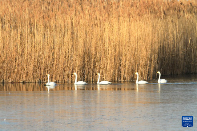 12月10日,几只大白天鹅在甘肃张掖国家湿地公园的水面上悠闲游弋。