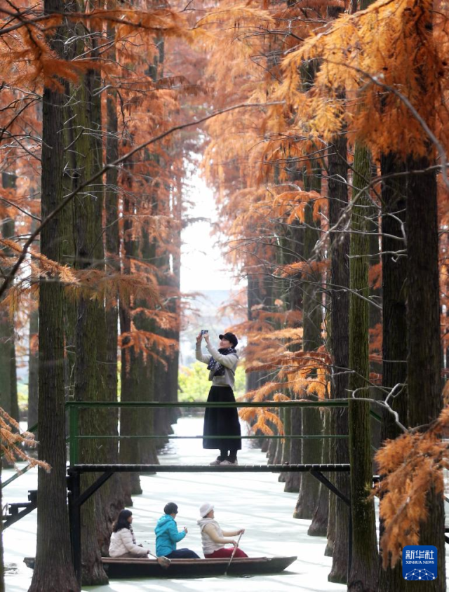 12月9日,游客在江苏省扬州市渌洋湖湿地公园的“水上森林”拍照游览。