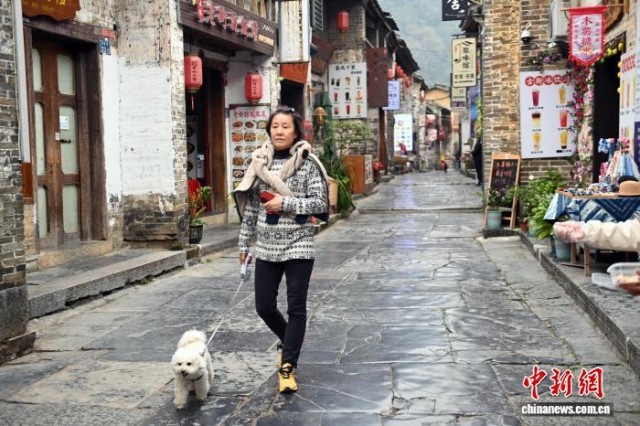 图为游客走在黄姚古镇青石板路上。中新网记者 蒋雪林 摄