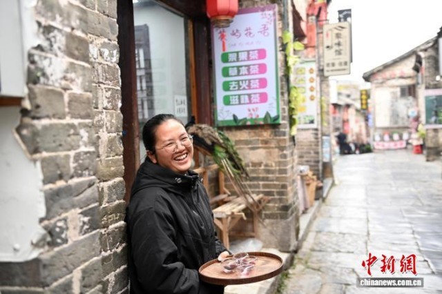 图为古镇上,一位买花茶的年轻人笑容满面迎客。中新网记者 蒋雪林 摄