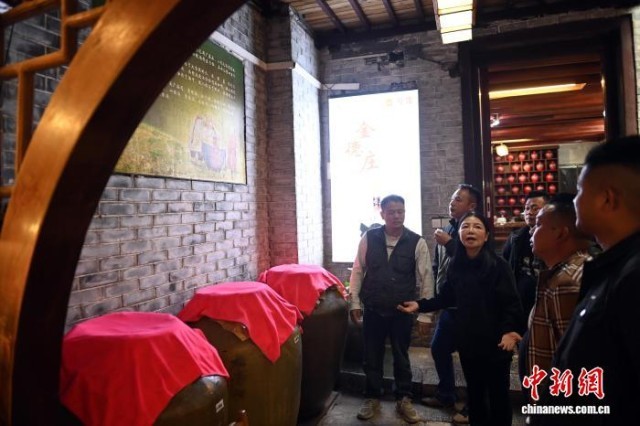 图为黄姚古镇金德街上的百年老号金德庄里,店主(左三)向顾客介绍金德庄的来历。中新网记者 蒋雪林 摄