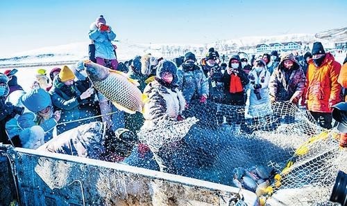 在沽源县库伦淖尔旅游度假区,渔民们进行冰上捕鱼,吸引了大批游客。田明摄