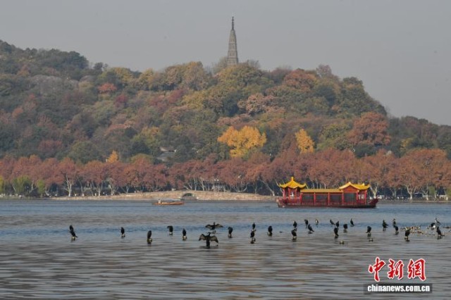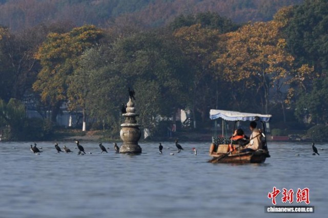 12月11日,游客乘手摇船与鸬鹚“相遇”。随着冬季气温降低,鸬鹚、鸳鸯、织女银鸥、凤头、白骨顶等候鸟纷纷飞抵浙江杭州西湖越冬,为冬日的湖光山色增添了灵动的生机。陆建利 摄
