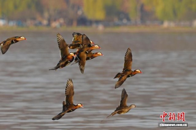 12月9日,西湖湖面上追逐的鸳鸯。随着冬季气温降低,鸬鹚、鸳鸯、织女银鸥、凤头、白骨顶等候鸟纷纷飞抵浙江杭州西湖越冬,为冬日的湖光山色增添了灵动的生机。陆建利 摄
