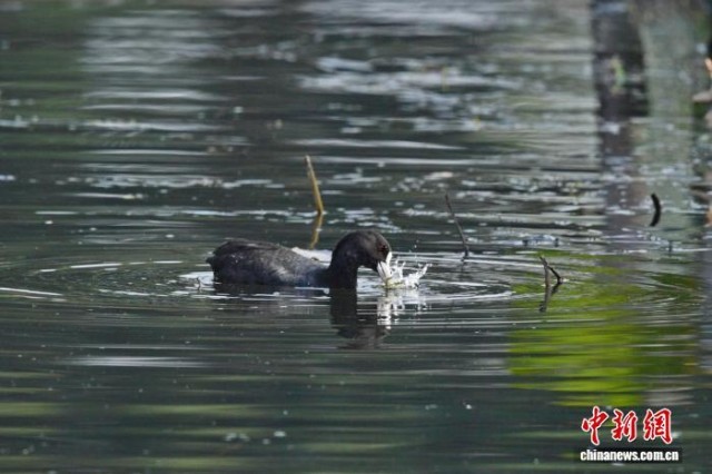 12月9日,白骨顶在觅食。随着冬季气温降低,鸬鹚、鸳鸯、织女银鸥、凤头、白骨顶等候鸟纷纷飞抵浙江杭州西湖越冬,为冬日的湖光山色增添了灵动的生机。陆建利 摄