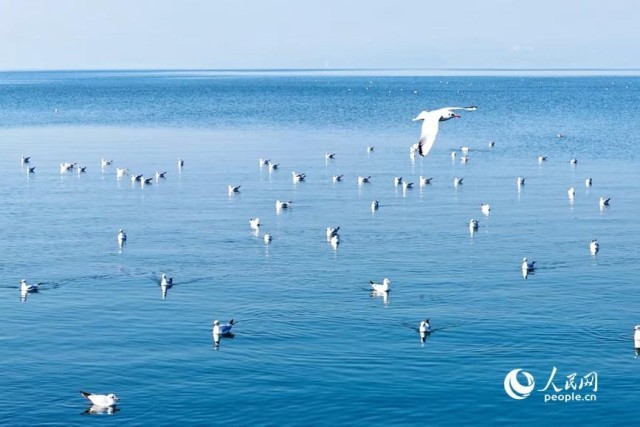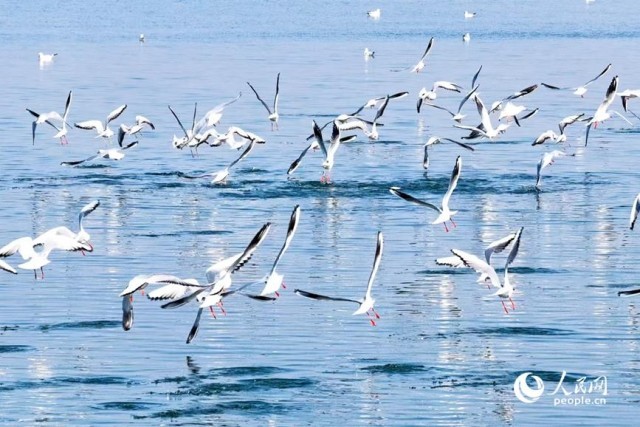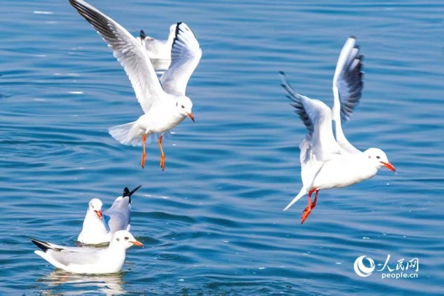 红嘴鸥在湖面嬉戏。人民网 程明辉摄