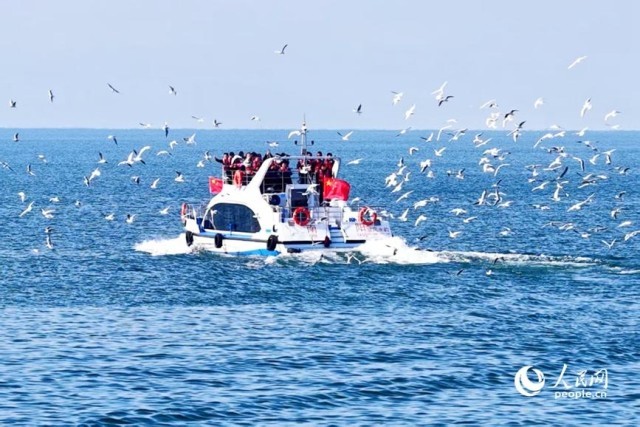 一群红嘴鸥追着船尾翻飞。人民网 程明辉摄