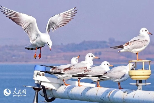 临水设施成了红嘴鸥的冬日歇脚台。人民网 程明辉摄