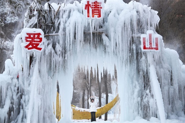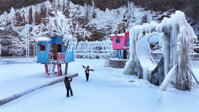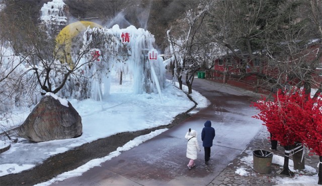 12月21日,游客在邢台市信都区天河山风景区冰瀑景观打卡拍照。