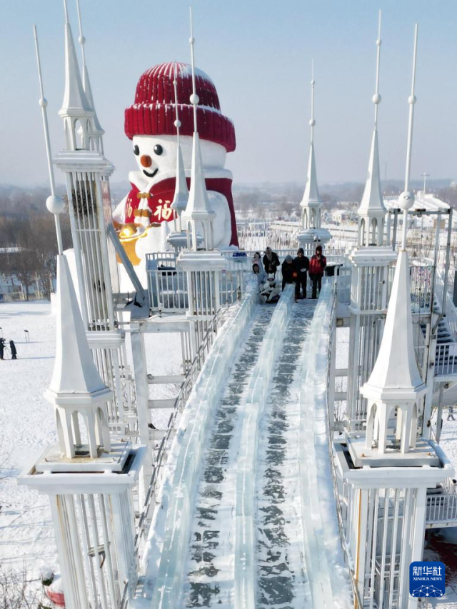12月24日在哈尔滨外滩德嘉雪人码头冰雪景区拍摄的大雪人(无人机照片)。