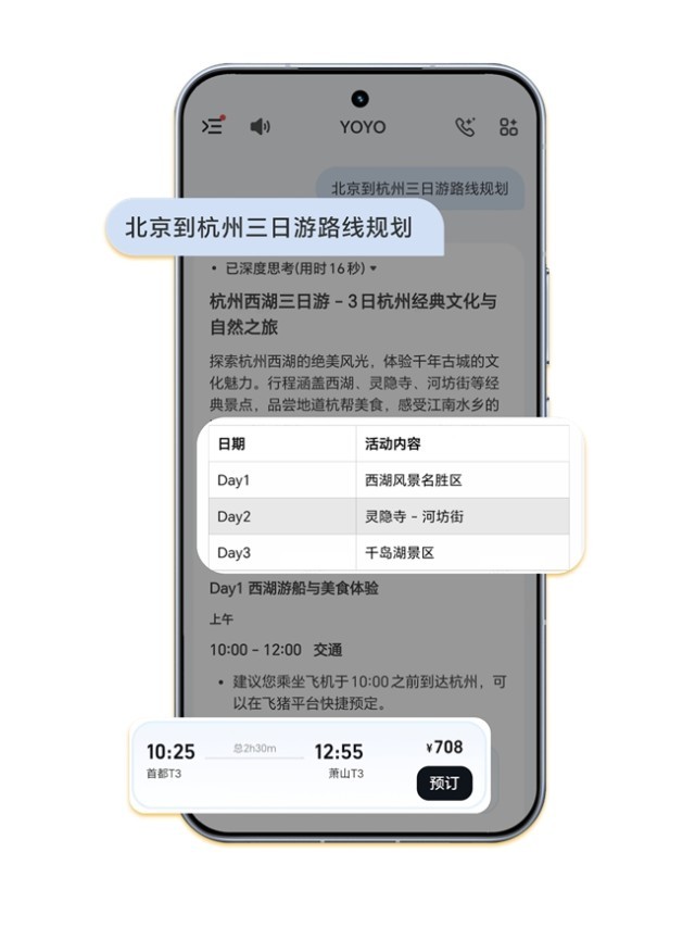 相较于传统App打开-搜索-筛选-查看的流程,如今用户则无需反复研究制定出游攻略、多平台比价,只需对YOYO说一句:“北京到杭州三日游路线规划”,它便能深度理解“短程”“小众”等用户意图,结合实时航班动态、酒店余房、景区人流数据等,分析整理出结构清晰的综合方案。如果临时想调整计划,只需告诉它:“第二天不想去西湖,有没有室内替代方案?”行程随之动态更新,灵活如私人定制。