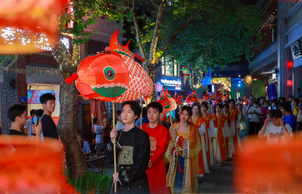 非遗踏歌行巡游全面升级!游客可现场参与互动,更有机会与巡游NPC共舞,以行进式舞蹈贯穿全程,展现衡山民俗风情。