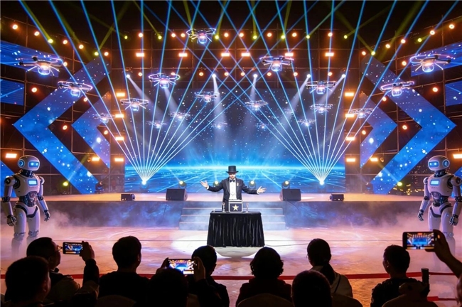 两大惊喜承包你的夜晚时光!奇幻灯光魔术夜上,炫酷激光秀与奇妙魔术轮番上演,氛围感拉满;无人机足球趣味障碍赛、AI机器人与机器狗巡展,科技感与趣味性十足,大人小孩都能玩嗨。