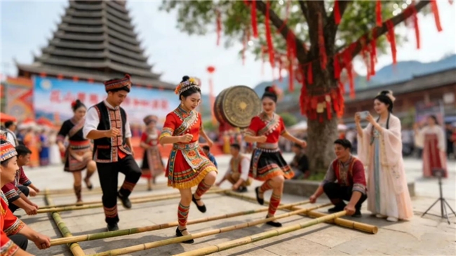 沉浸式感受壮族文化魅力,就来这里!岜耀铜鼓广场上,欢快的竹竿舞邀你互动,花山乐舞、敬酒歌轮番上演,歌声里满是花山儿女的热情;祈福园菩提树下,壮族姑娘邀你系上红飘带,许下新年心愿,手牵手围着祈福树载歌载舞,在欢声笑语中收获满满祝福。身着汉服打卡岩画核心区,拍照分享至社交平台,点赞达标还能领取文创产品!