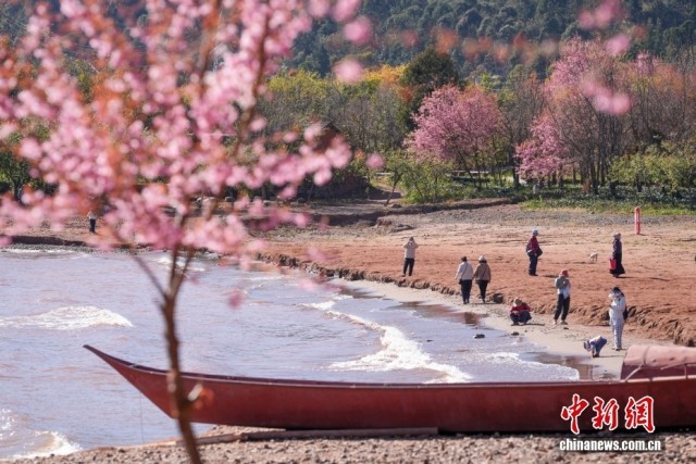 云南玉溪:游客抚仙湖畔赏冬樱