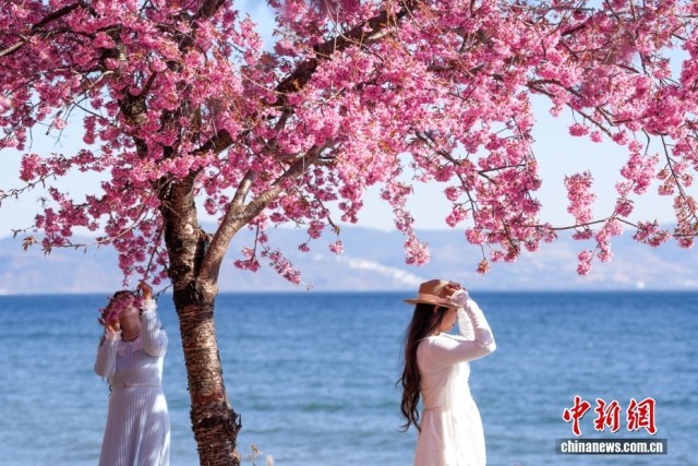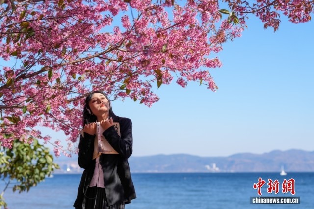 12月29日,游客在云南玉溪抚仙湖畔赏冬樱。