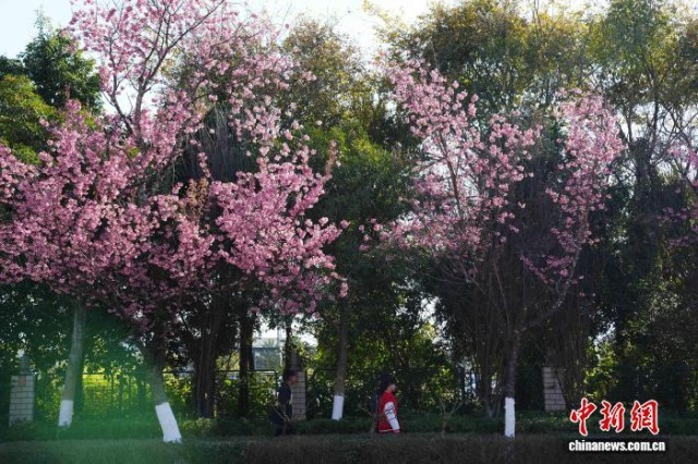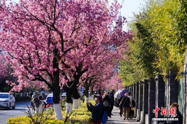12月29日,昆明街头盛开的冬樱花吸引市民。近日,云南昆明冬樱花盛开,勾勒出独属“春城”的冬日画卷。中新社记者 刘冉阳 摄